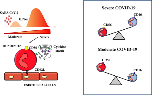 In the current study, we identified a circulating atypical monocyte subpopulation characterized by the expression of the transmembrane molecule CD56 (neural cell adhesion molecule) that displayed a consistent hyperinflammatory profile. Interestingly, CD56+ monocytes inversely correlated with the frequency of anti-inflammatory CD16+ monocytes and were significantly associated with disease severity.