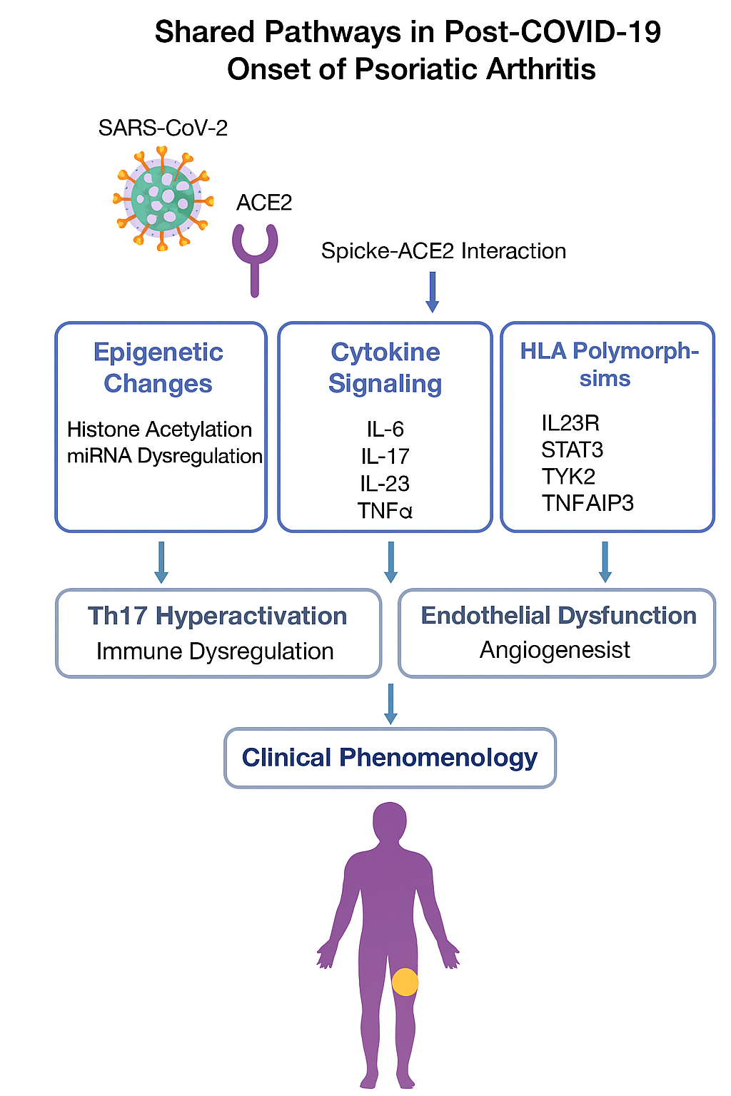 This manuscript demonstrates a compelling overlap in the genomic and immunologic architecture of COVID-19 and psoriatic arthritis. Shared polymorphisms in IL23R, STAT3, TYK2, and TNFAIP3 suggest that both conditions activate similar inflammatory cascades, particularly the Th17 axis and JAK-STAT signaling. The presence of ACE2 in synovial and epidermal tissues provides a mechanistic bridge for SARS-CoV-2 to initiate local inflammation, potentially triggering PsA in genetically predisposed individuals.