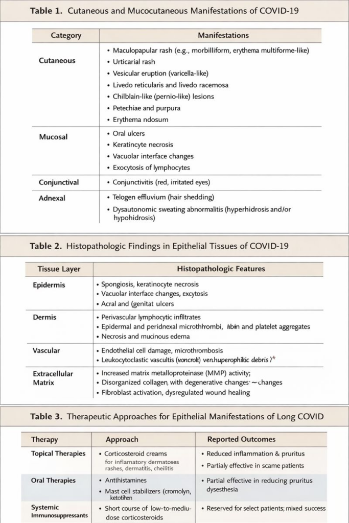 This review examines the etiology, viral genomics, epithelial physiology, tissue pathology, clinical manifestations, and therapeutic responses associated with SARS-CoV-2–mediated epithelial injury, with emphasis on dermal, epidermal, and matrix involvement.