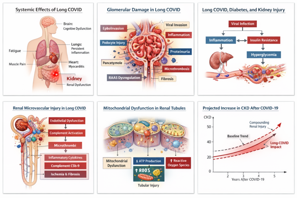 Long COVID is characterized by remarkable heterogeneity in clinical expression. Patients frequently report fatigue, dyspnea, cognitive impairment, dysautonomia, and metabolic disturbances months after initial infection. However, the kidney—an organ with extensive vascularization and high metabolic demand—has increasingly been recognized as particularly vulnerable to both direct viral injury and secondary inflammatory cascades.