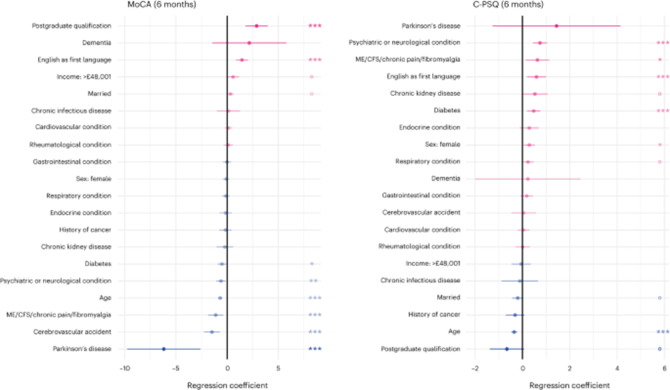 The Montreal Cognitive Assessment (MoCA) score (a measurement of objective cognitive deficits) at 6 months was significantly associated with a range of baseline characteristics, including age, education level and several comorbidities (Fig. 1 and Supplementary Fig. 1). The cognitive items of the Patient Symptom Questionnaire (C-PSQ5,30, a measurement of subjective cognitive deficits) were also associated with a range of baseline characteristics including age and comorbidities (especially psychiatric or neurological conditions and chronic fatigue syndrome (CFS)/chronic pain/fibromyalgia; Fig. 1 and Supplementary Fig. 2). Younger participants and those whose first language is English had significantly worse C-PSQ but better MoCA. All these variables were included as covariates in subsequent analyses (whether they were significantly associated with cognitive outcomes or not).